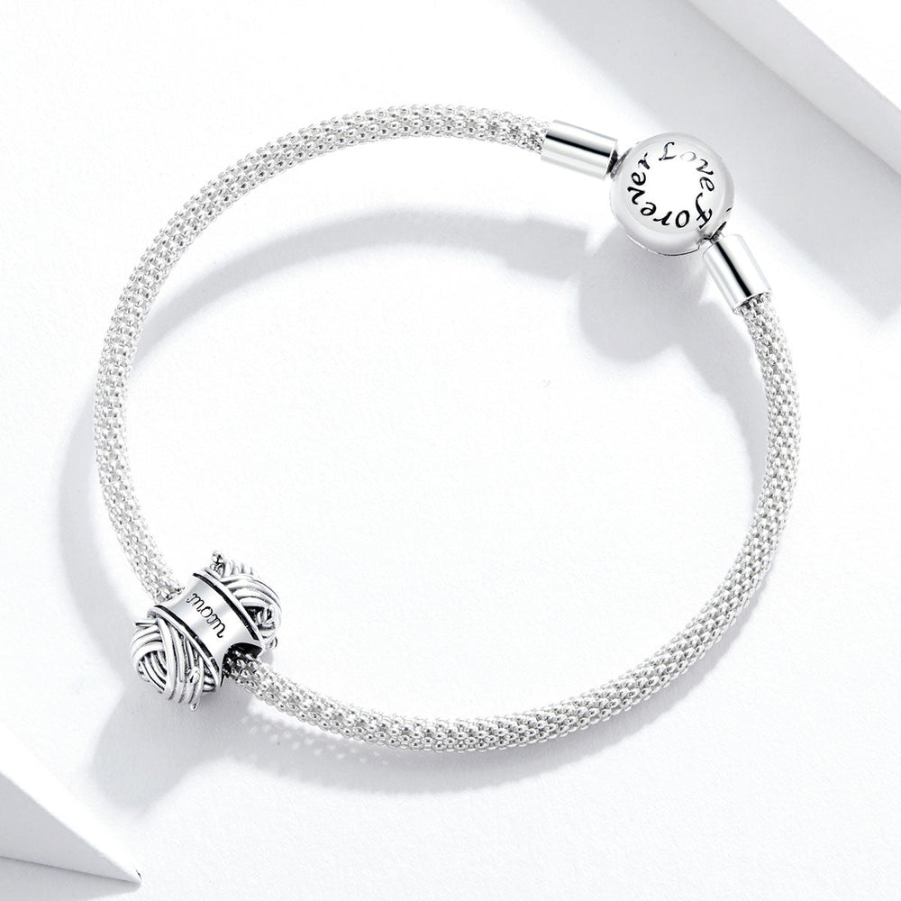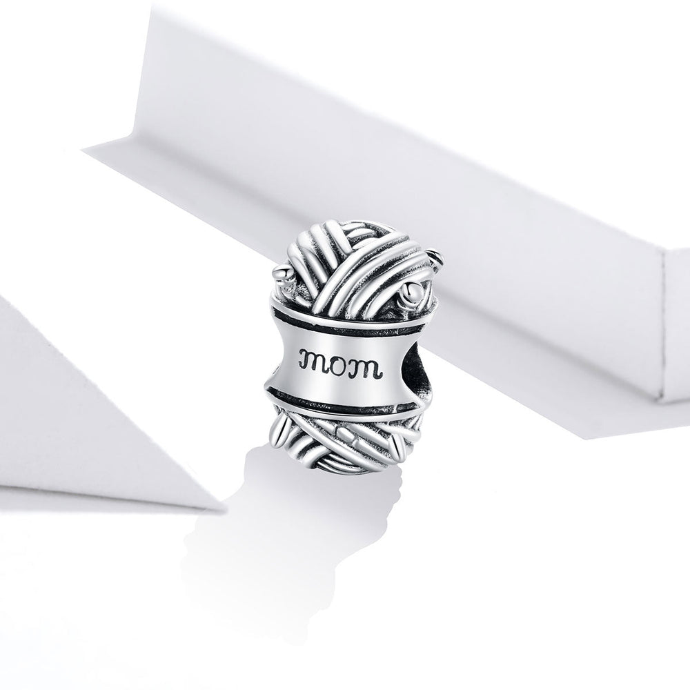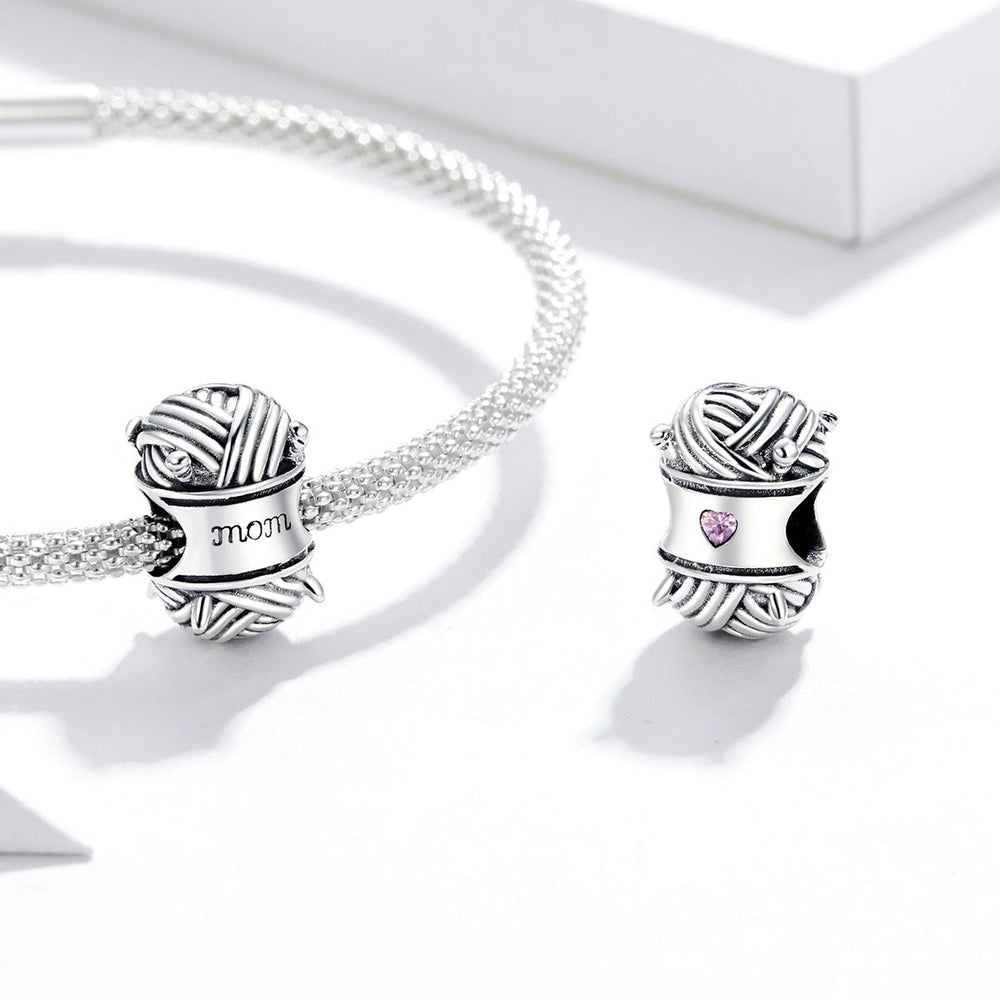 Ball of Wool Charm. Beautifully made from sterling silver, this charm is perfect for the crafting mum who loves to knit or crochet. Engraved with 'mom' and embellished with a pink cubic zirconia, its sure to delight anyone who loves working with yarn.