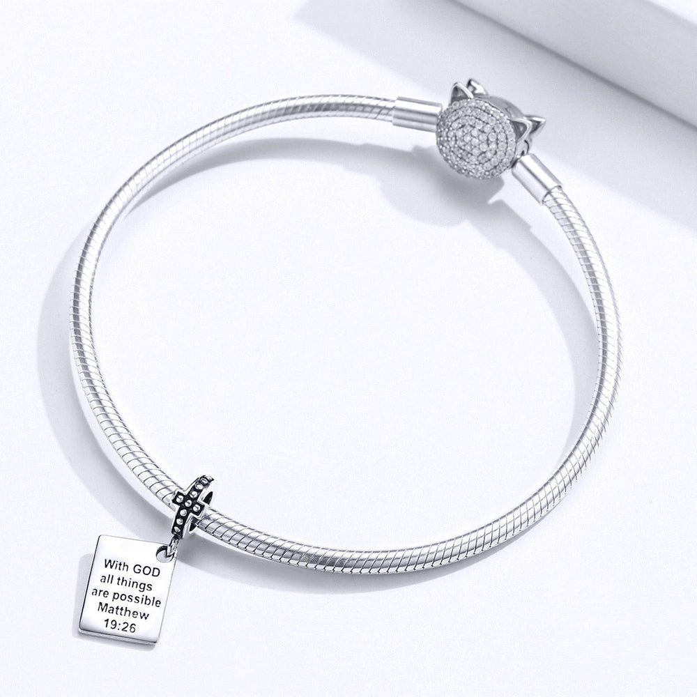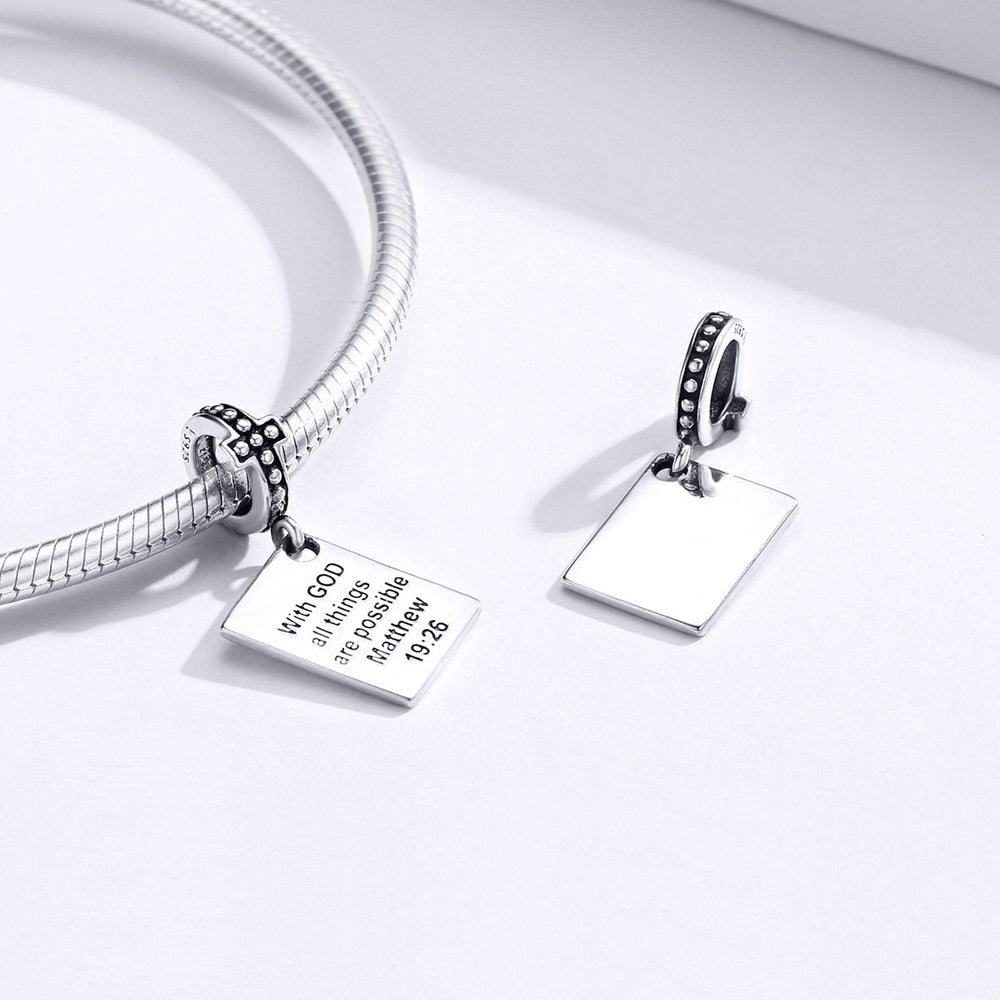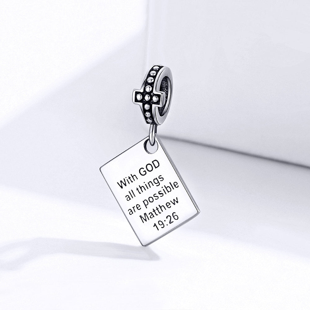 Wear your faith close to your heart with our inspiring Bible Verse Charm. Featuring the engraving "With GOD all things are possible Matthew 19:26". Add this charm to your favourite bracelet for a constant reminder of strength and hope.