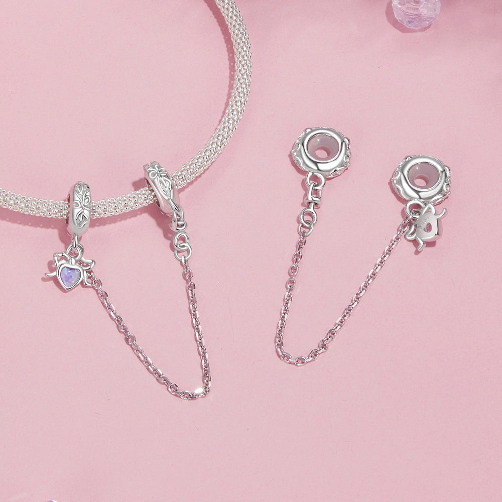 Featuring a synthetic opal heart and delicate embossed bow details, this sterling silver safety chain is designed to secure charms on your bracelet. It adds beauty while providing peace of mind.