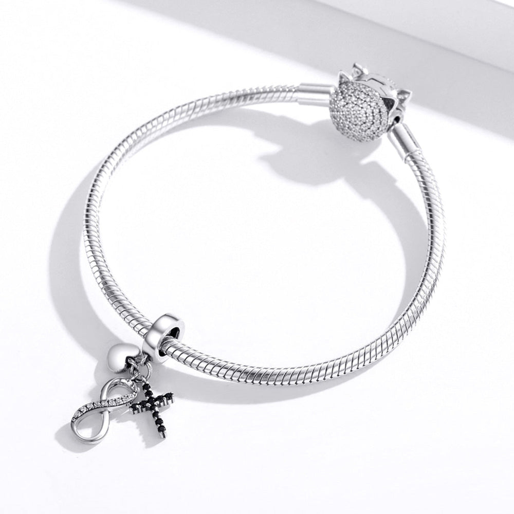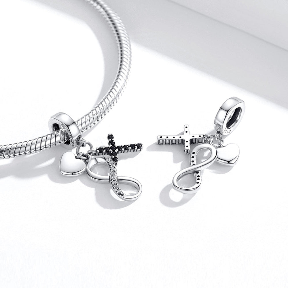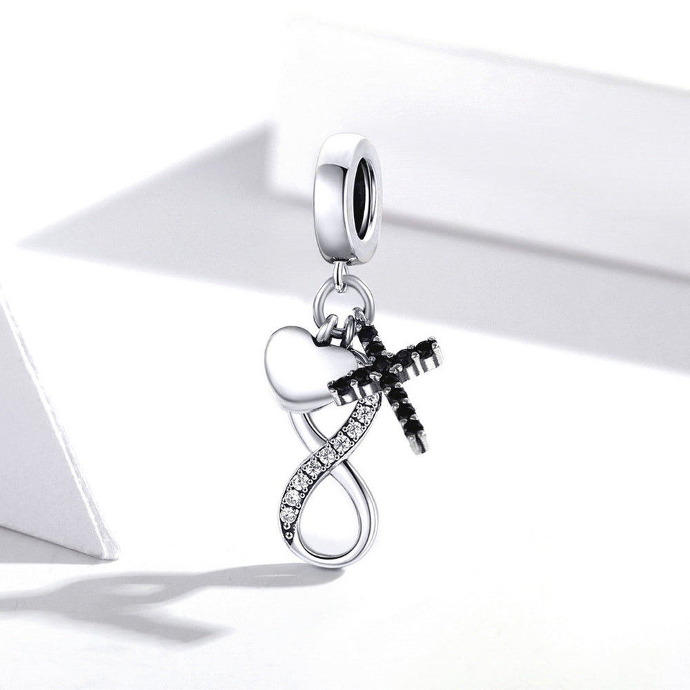 Experience the eternal love and faith with our Infinity Cross & Heart Dangle Charm. This beautifully crafted charm features a delicate cross and infinity loop. A perfect addition to any charm bracelet or necklace, it's a meaningful gift for yourself or a loved one.