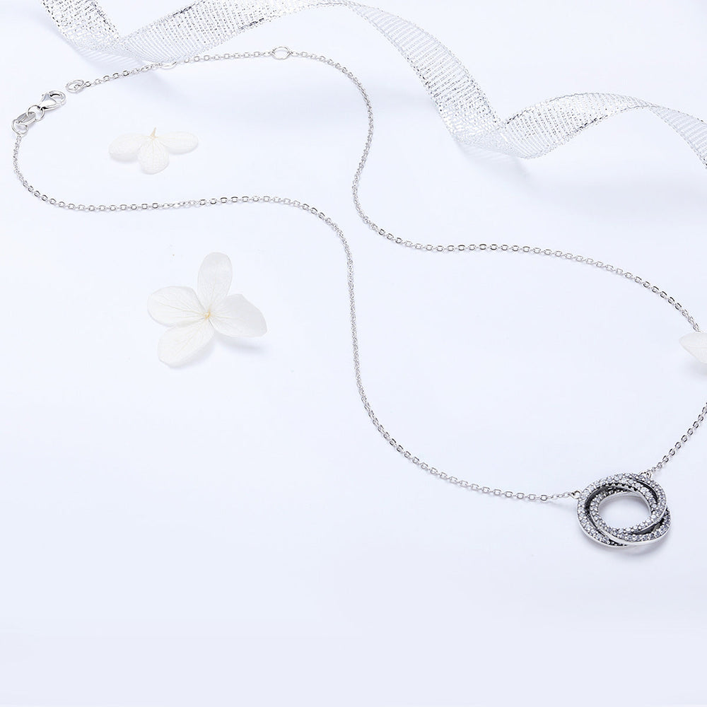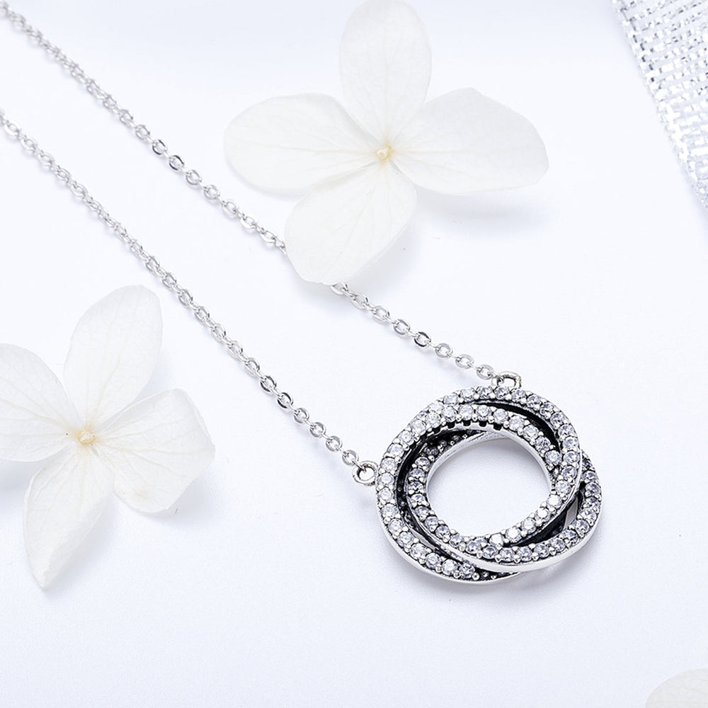 This delicate necklace is encrusted with cubic zirconia stones, making it the perfect accessory for any special occasion or fancy dinner. The intertwined circles represent unity and connection, making it a meaningful addition to any jewellery collection. Buy it for yourself or gift it to a loved one.