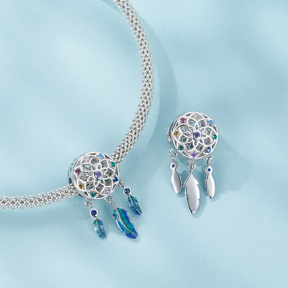 Catch dreams in vibrant style with our Rainbow Dreamcatcher Charm! This sterling silver piece features cubic zirconia stones and coloured enamel feathers. Perfect for adding a splash of whimsy to your bracelet or necklace while keeping bad dreams at bay!