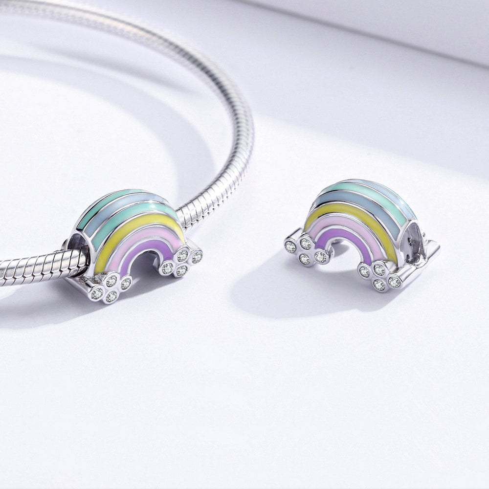 Step out into the sun with our beautiful sterling silver Rainbow With Clouds Charm! Featuring a pastel rainbow and sparkling cubic zirconia clouds, this charm is perfect for the nature-lover in you. Buy it for yourself or buy it for a loved one.
