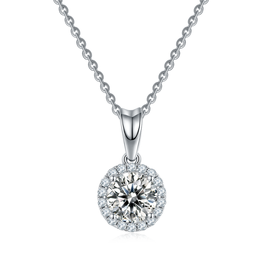 Introducing our stunning Round Moissanite Pendant Necklace - the perfect accessory to add sparkle and elegance to any outfit. Featuring a high-quality round Moissanite stone surrounded by cubic zirconias, this necklace is sure to catch the eye and make a statement. Elevate your look with this must-have piece of jewellery.