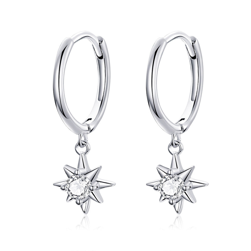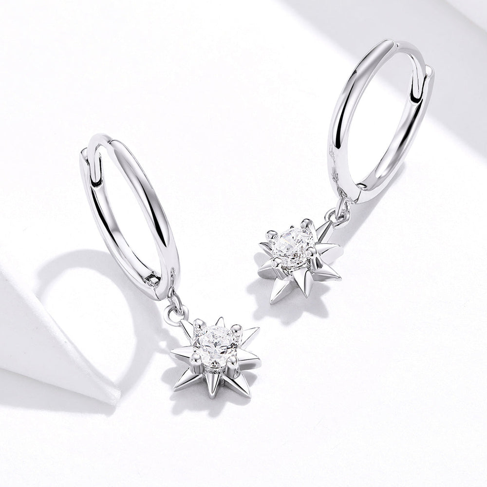 Add a little bit of sparkle to your look with our Silver Star Dangly Earrings. These beautifully petite earrings feature cubic zirconia stones in the centre of a starburst design drop. The perfect accessory to add a touch of elegance to any outfit.
