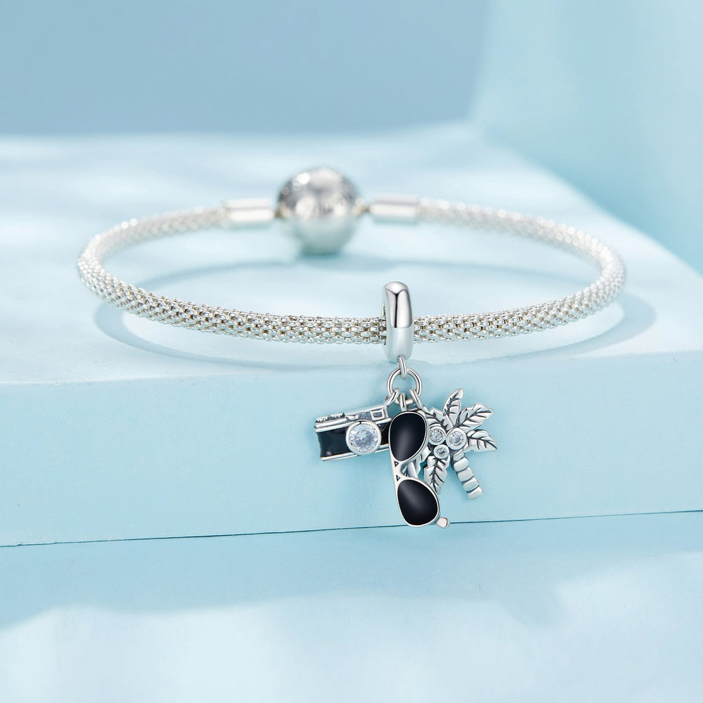 Capture the memories of your beach getaway with our Tropical Holiday Vibes Dangle Charm. Featuring a camera, a palm tree, and a pair of sunnies, this charm is the perfect way to remember a special vacation or gift for someone who loves the beach. Let this charm transport you to a world of sun, sand, and relaxation.
