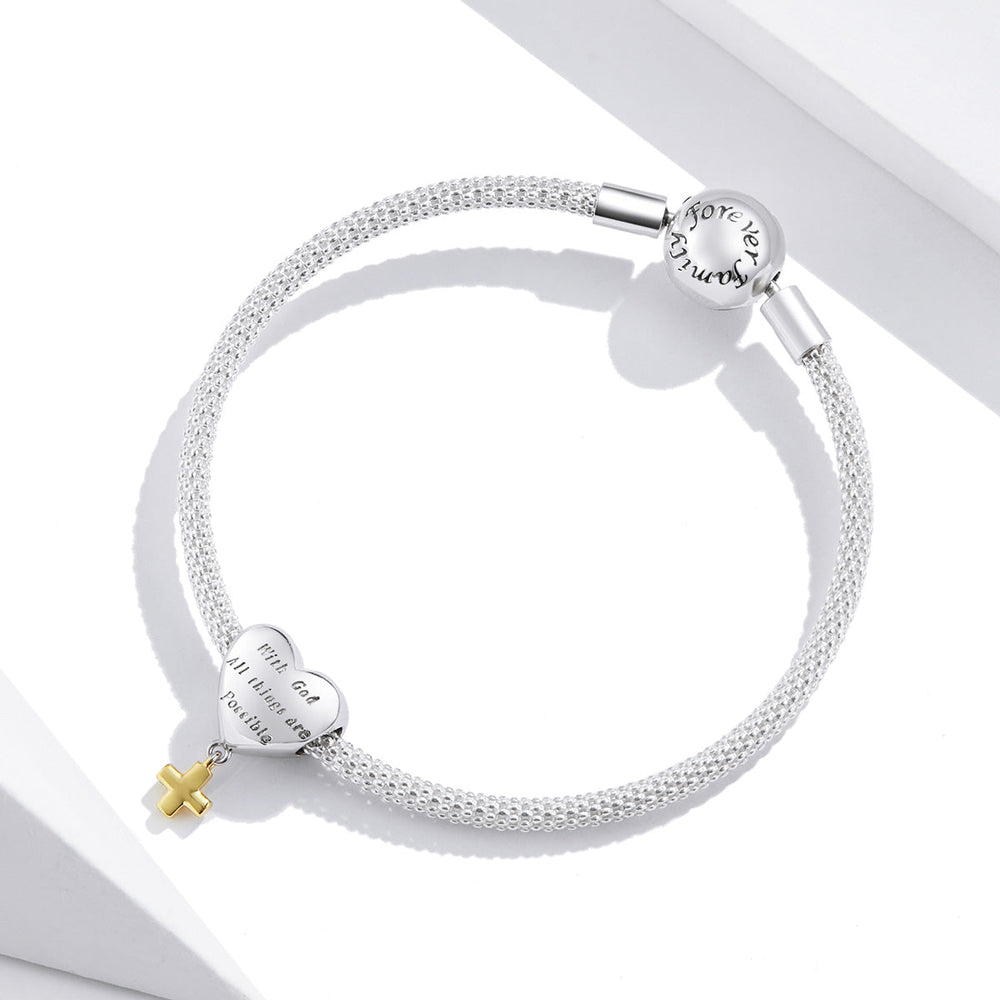 Embrace the power of your faith with our 'With God All Things Are Possible' charm. A constant reminder to trust in God through life's journey. Exquisitely crafted in sterling silver with a gold-plated cross, this charm is a beautiful daily reminder that with God, all things are possible.